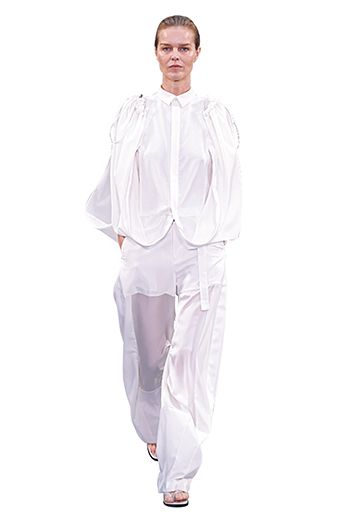 色そのものに意志の強さを感じさせる白は、透け感をともなった繊細な素材でたおやかな印象に。1色でも抑揚のついた見た目に仕上がる流線的なALL白スタイルは、複数のブランドで見られた今シーズンの注目株。