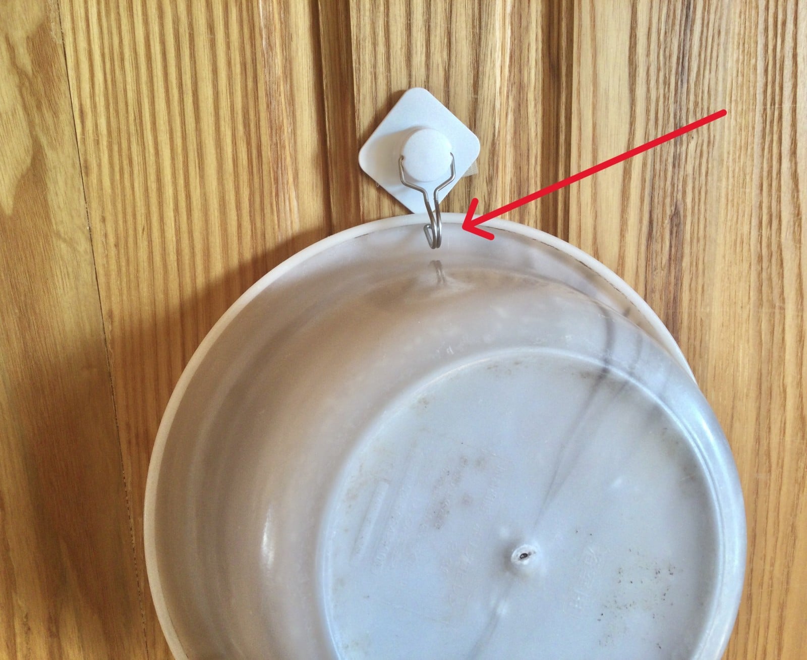 筆者の場合、フックを下向きにしただけで、穴の開いていない洗面器を無理なくかけることができました! フックのカーブ部分にアイテムの縁や持ち手をそっと乗せるようにかけると、安定する場合があります。