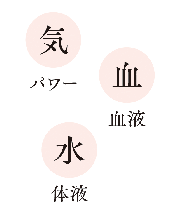 漢方では体は「気」「血」「水」の3つの要素が体内でバランスよくめぐることで、健やかな状態を維持できると考えられています。