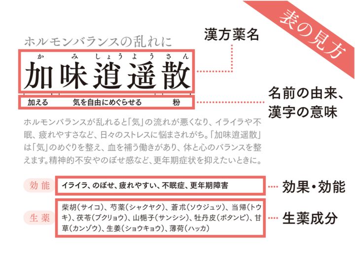 また、今回、漢方薬の名の由来をひもといてみました。漢字には生薬名や、「湯、散、丸」(薬のタイプ)、「地黄丸」(腎を助ける薬)など意味が記されています。ぜひ選ぶときの参考に。