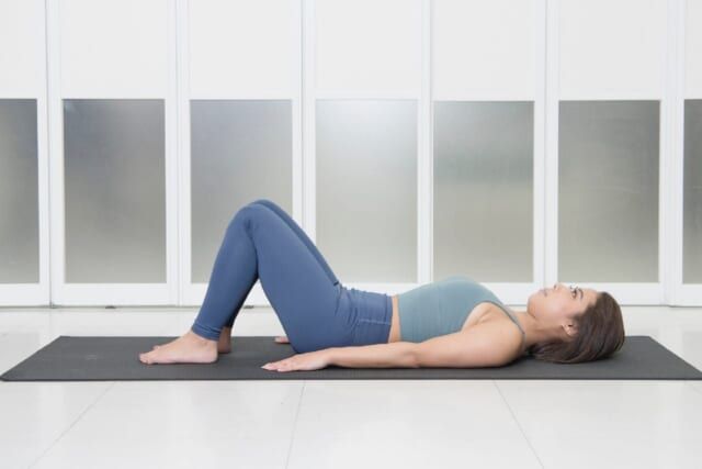 仰向けになり、ひざを立てて脚は腰幅に開きます。かかとはお尻に近づけ、足裏で床をしっかり踏みます。腰は反らず、骨盤を安定させた状態をつくります。
