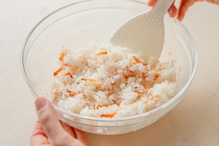 3. ごはんに桜えび、新生姜、白ごま、塩を混ぜる。