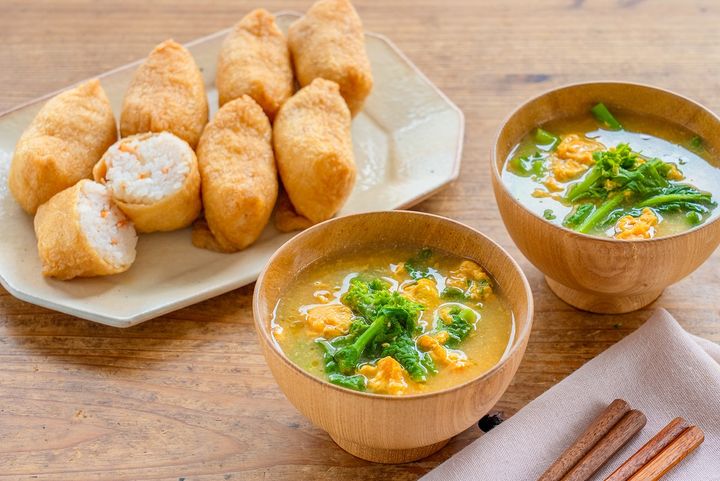 妻:それなら、桜えびが香るいなり寿司と、菜の花とふんわり卵のみそ汁はどうかな?