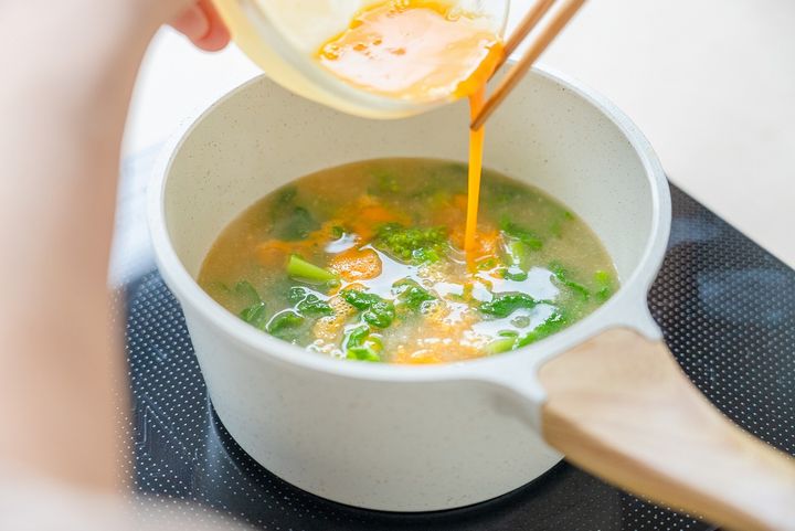妻:みそ汁の方は、菜の花をさっと煮てから、とろみをつけて卵を回し入れるのがポイント。