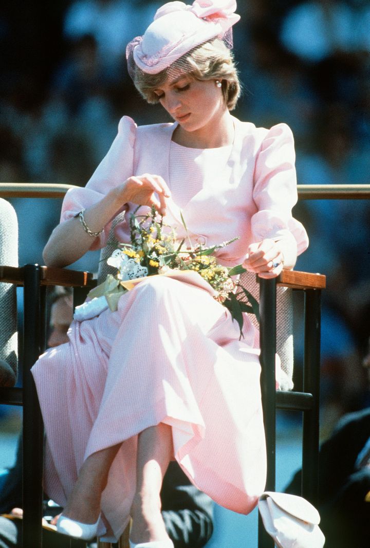 これぞまさにリアル・プリンセス。オフショルダーのシアーなフリルドレスは、ダイアナ元妃の妖精のような美しさを最大限に引き出している。パールのチョーカーと組み合わせて、永遠のアイコンが生み出した不滅のスタイリングのひとつ。
