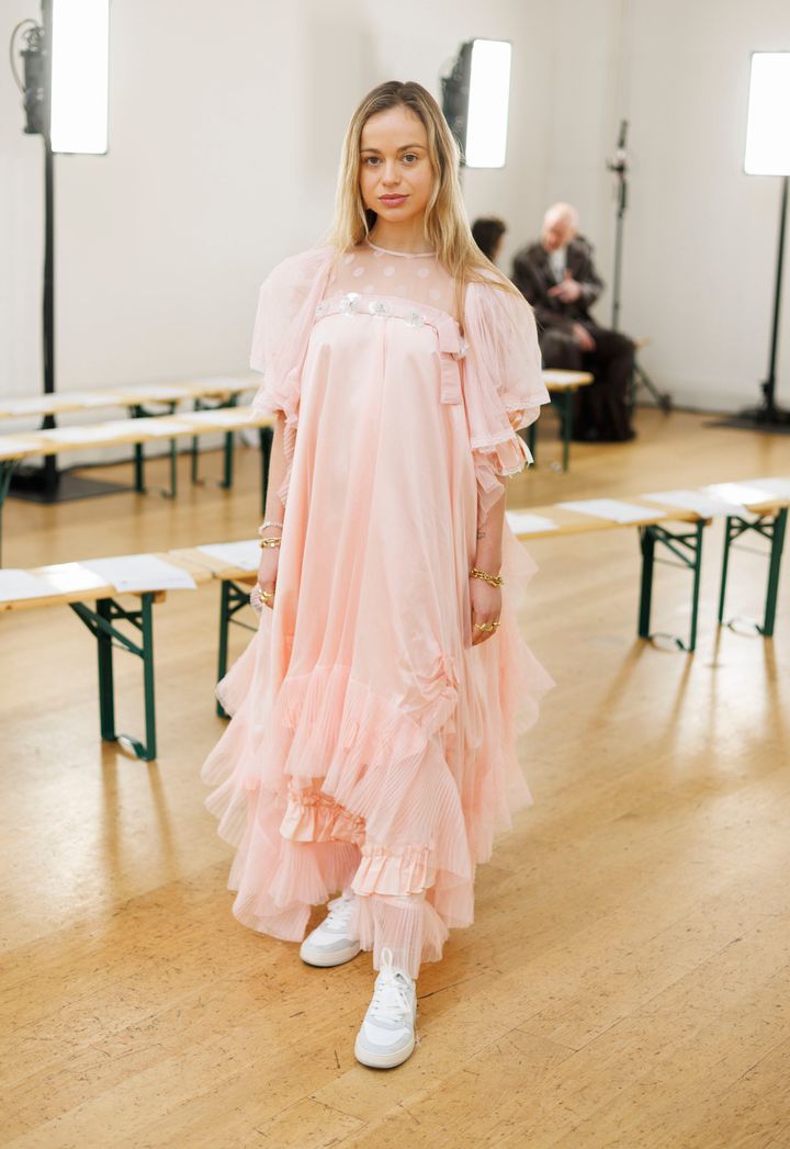 透け感のあるチュールと、ティアードフリルが織りなすピンクのドレス。足元は白スニーカーでカジュアルダウンすることで、まるでお菓子のような甘さのなかに彼女らしい自由なスピリットが宿る。