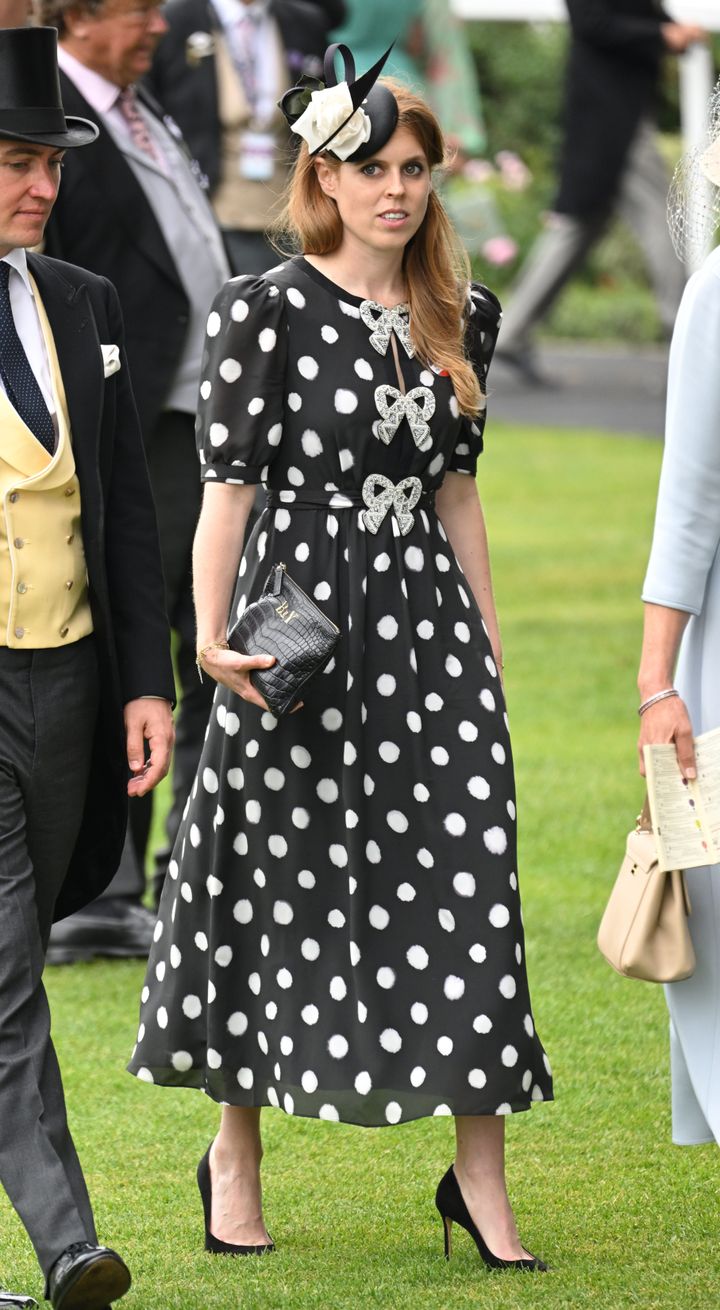 バッキンガム宮殿のガーデンパーティやロイヤルアスコットで披露された、繊細なレースとドット柄のコンビネーションが可憐な「エリー サーブ」のドレス。首元のボウタイが、甘さのなかにクラシックな品格を添えている。