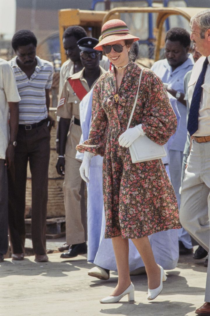 アン王女がまとうのは、落ち着いたトーンの花柄ドレス。袖のボリューム感や首元のリボンなど、現代のヴィンテージブームにも通じるエッセンシャルな一着。グローブやバッグなどの小物はホワイトで合わせて爽やかに仕上げた。