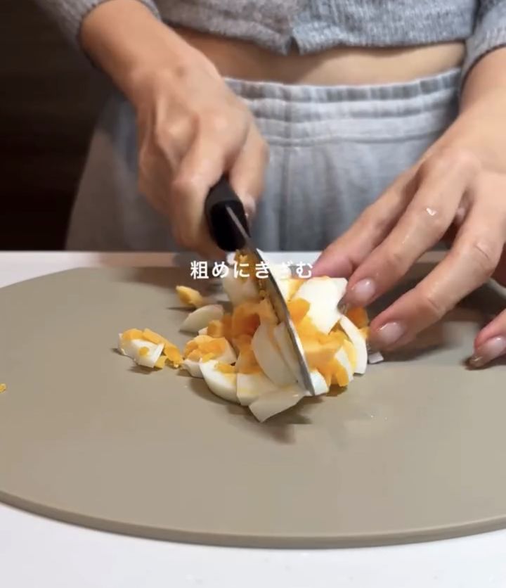 ゆで卵をまな板にのせ、包丁で粗めに刻んでいきます。