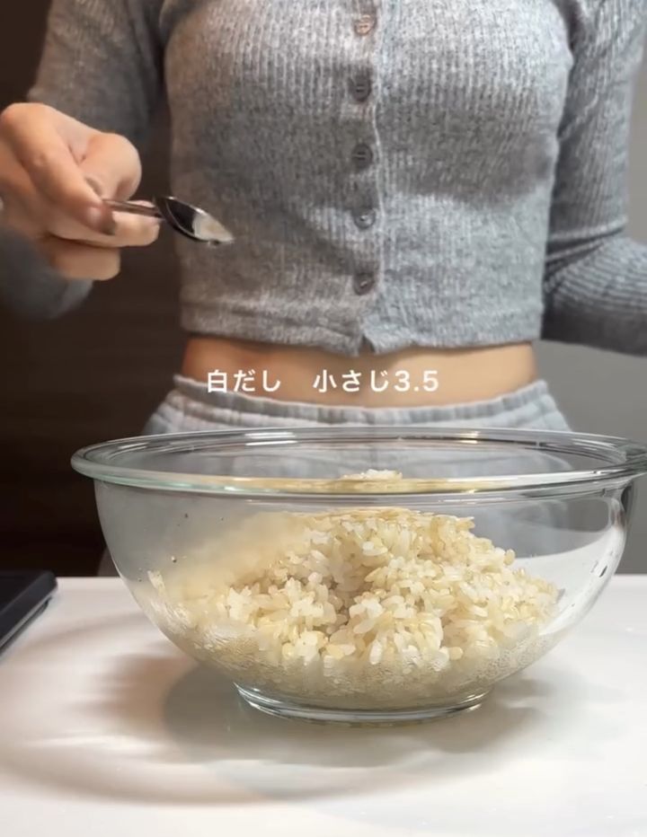 まずは、炊き立ての玄米に白だしを回し入れます。