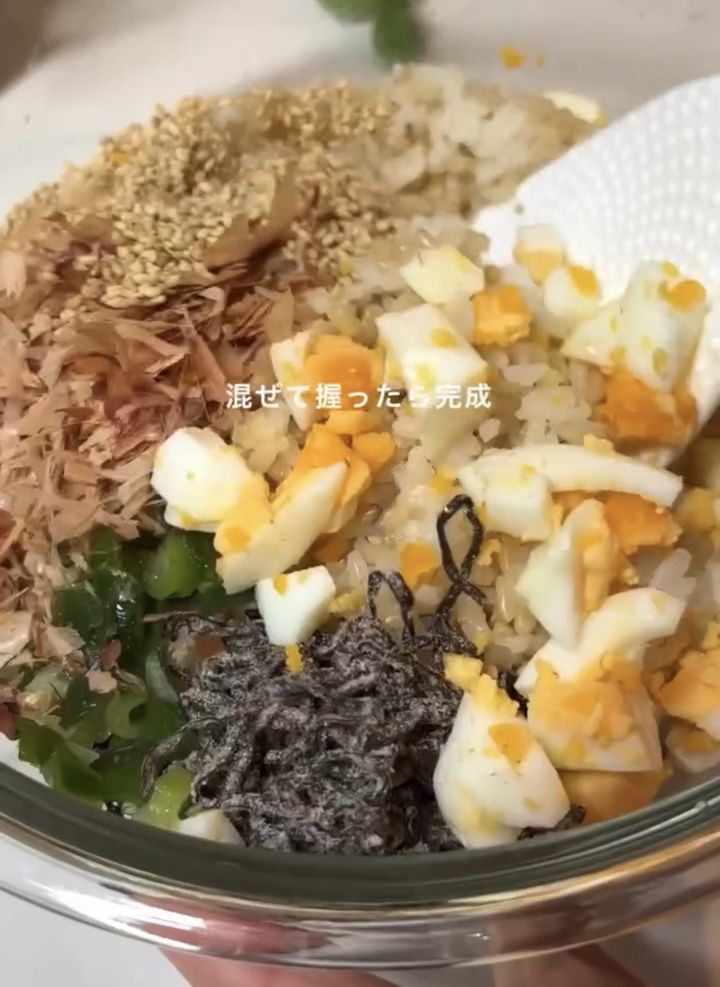 最後に、刻んだ卵、塩昆布、ネギ、鰹節、ごま、ゆで卵をボウルへ贅沢に投入!