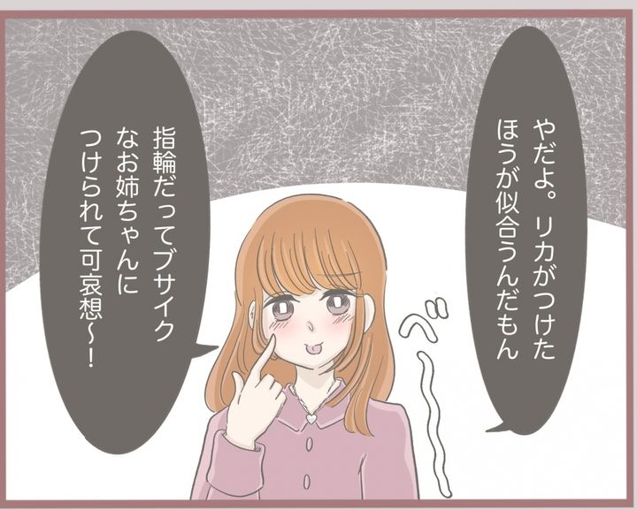 ゆいには一つ年下のフランス人形のように美形の妹リカがいて…。かわいくてちやほやされる存在のリカは、小学校にあがるとゆいに対してぞんざいな態度を取るようになった。ゆいの誕生日プレゼントも当たり前のように「ちょうだい」と手を出す。