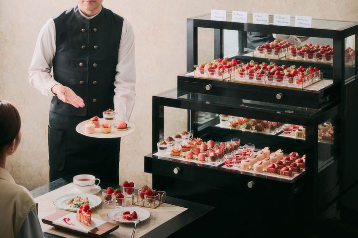 「The Royal Lounge STRAWBERRY」は、そんな素敵な場所で楽しめる、フルサービススタイルのスイーツビュッフェ。スタッフがスイーツやセイボリーをゲストの席まで届けてくれて、着席したままで好きなメニューをゆっくりと堪能できます。