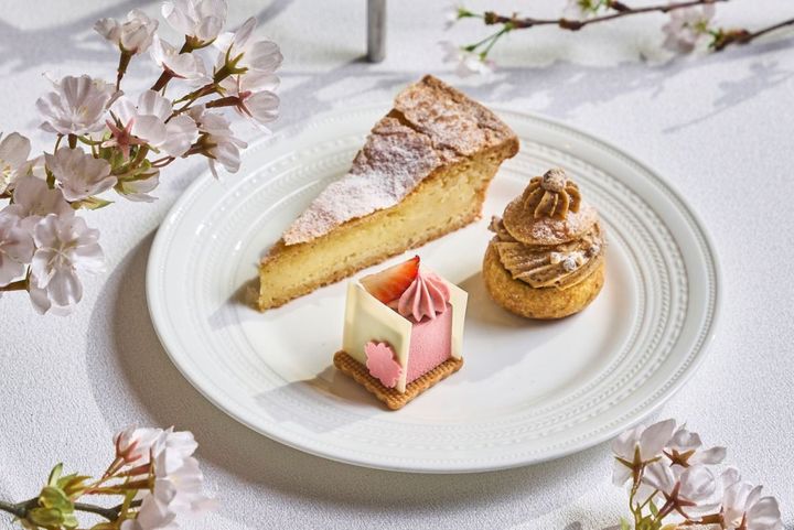 「ライチゼリーとココナッツメレンゲ」は、春の陽気にぴったりなさわやかなライチゼリーに甘酸っぱいイチゴのソースを重ね、ココナッツ風味のメレンゲを添えた一品。さらに、桜フレーバーのシャンティーを重ねた「いちごと桜のスポンジケーキ」は、なんとホールケーキで用意されています。