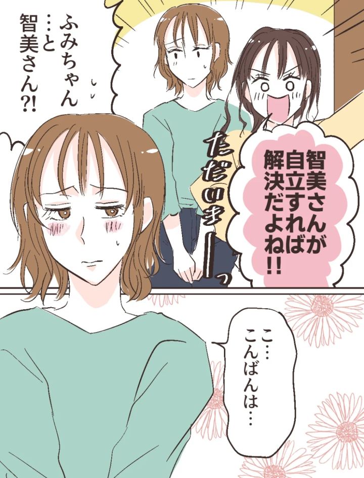 勢いよくリビングに入るなり、ふみのは「智美さんが自立すれば解決だよね!!」と言いました。