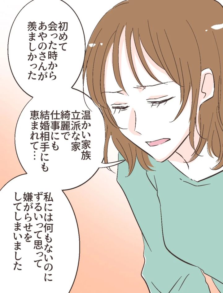 智美さんは、申し訳なさそうに、でも辛そうな顔で、私のことが羨ましくて嫌がらせをしていたことを認めました。智美さんにとって、私には温かい家族がいて立派な実家があり、おしゃれして仕事にも結婚相手にも恵まれているように見えていたのだそうです。そして自分には何もないのにずるいと思っていたのだと。なんと返事して良いかもわからず、ただ智美さんの告白に驚いていました。