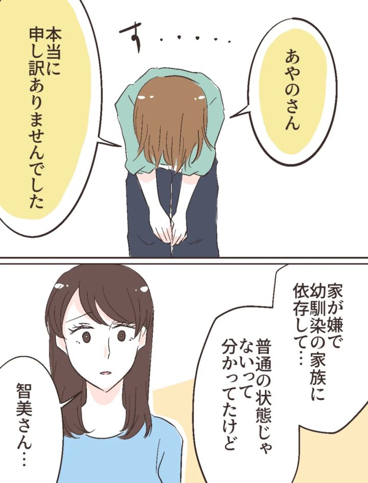 智美さんは深々と私に頭を下げて「あやのさん、本当に申し訳ありませんでした」と言いました。これまでの智美さんを思い返すと、本当に別人のようです。智美さんは、初めて自分の本当の気持ちを打ち明けました。「うちが嫌で幼馴染の家族に依存して。普通の状態じゃないってわかってた」と。