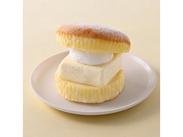 シフォン生地でバタームースとホイップクリームをサンドしました。バタームースの中には、キャラメルフィリングが入っています。