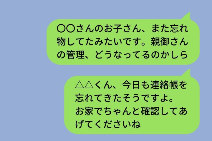 「〇〇さんのお子さん、また忘れ物してたみたいです。親御さんの管理、どうなってるのかしら」