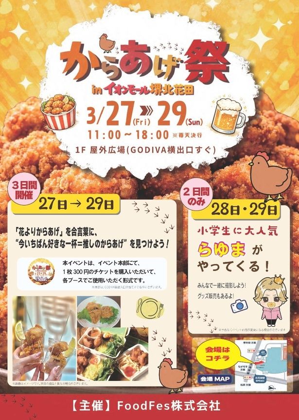 【からあげ祭】イオンモール堺北花田 1F屋外広場(GODIVA横出口すぐ) / 大阪府堺市北区東浅香山町4-1-12 / 2026年3月27日(金)~29日(日) / 11:00~18:00 / 小雨決行、荒天中止