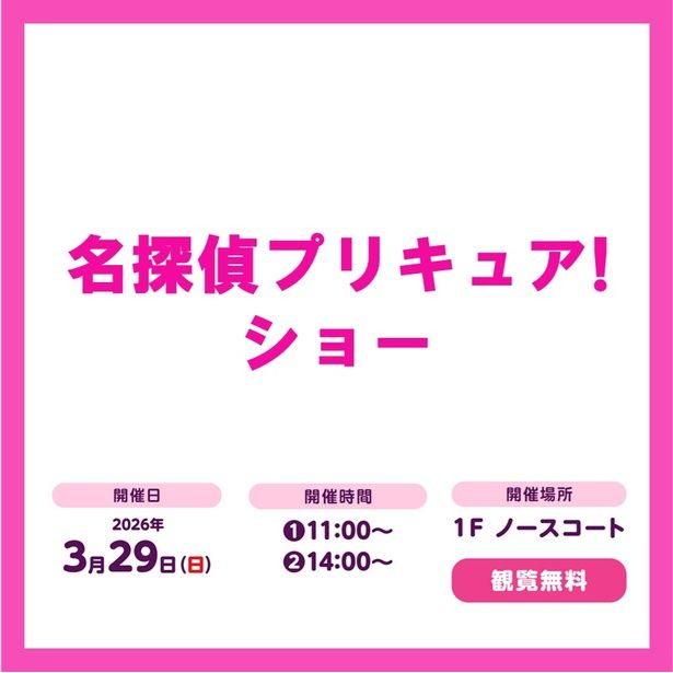 【名探偵プリキュア!ショー】イオンモール鶴見緑地 3F サンシャインコート / 大阪府大阪市鶴見区鶴見4-17-1 / 2026年3月28日(土) / (1)10:30~、(2)14:00~ / 1回目観覧のみ9:45~9:58に立体駐車場5F 32番出入口より3F サンシャインコートへ先行入場。2回目観覧には1人につき1枚整理券が必要。当日9:00より立体駐車場5F 32番出入口にて整理券を配布(先着300人、代表者1人につき4枚まで)