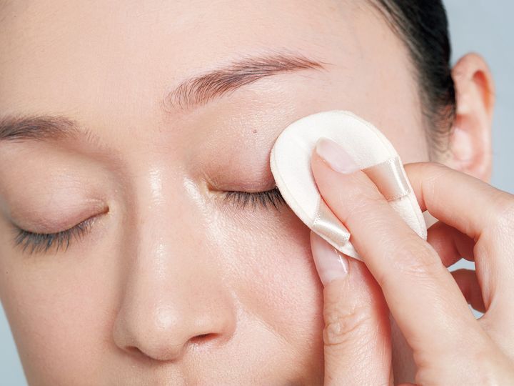 【2】 上まぶたには、パフを折って持ち、軽くスワイプ塗りが◎。シワを埋めるように薄くつけて。