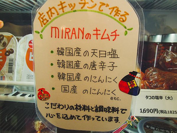 ミランさん手作りのキムチは大人気! お店が休みの火曜日は美味しいキムチづくりで大忙しだそう。なので、水曜日はキムチDay!伺った日もすでに売り切れ。白菜キムチ(615円)やきゅうりキムチ(615円)もあります。韓国産の塩とニンニクで本場の味を楽しめますよ。