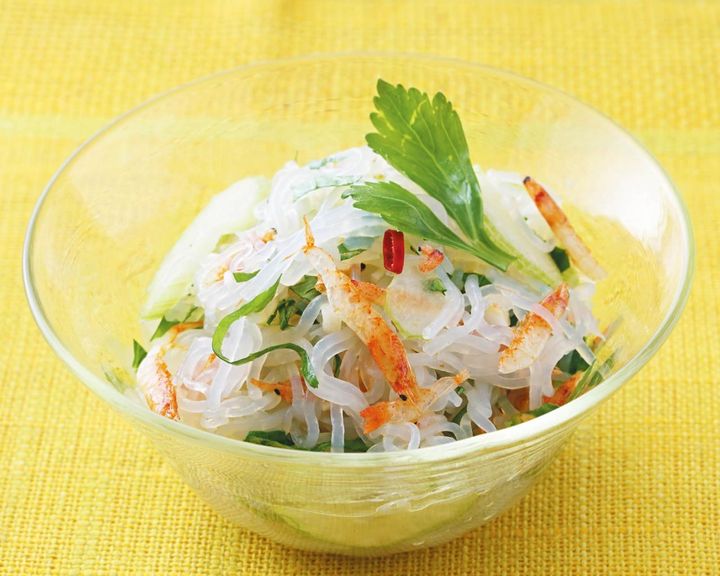 ❷ボウルに【A】を混ぜ合わせ、しらたき、桜えび、赤唐辛子、にんにくを入れて混ぜ、セロリとセロリの葉を加えさらに和える。器に盛り、セロリの葉少々(飾り用・分量外)を添える。