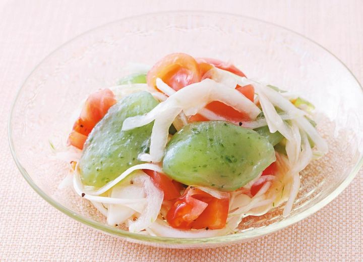 免疫力アップや美肌効果も!【こんにゃく】たっぷりのサラダレシピ2選「新玉ねぎトマトのマリネ/セロリのエスニックサラダ」