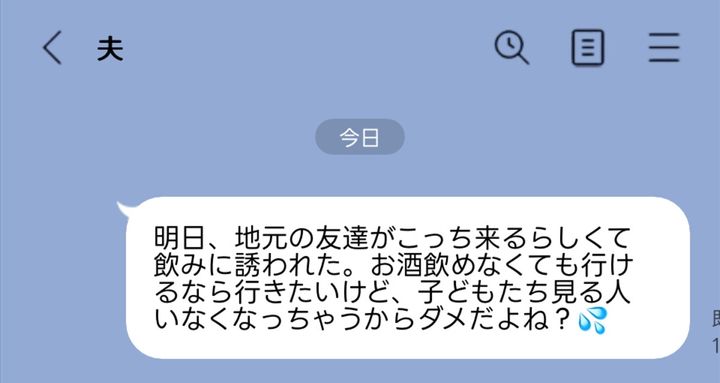 先程「明日、地元(高速で2時間半)の友達がこっち来るから飲みに誘われた。お酒飲めなくても行けたら行きたいけど、子どもたち見る人いなくなっちゃうからダメだよね?」と旦那からLINEが来ました💦