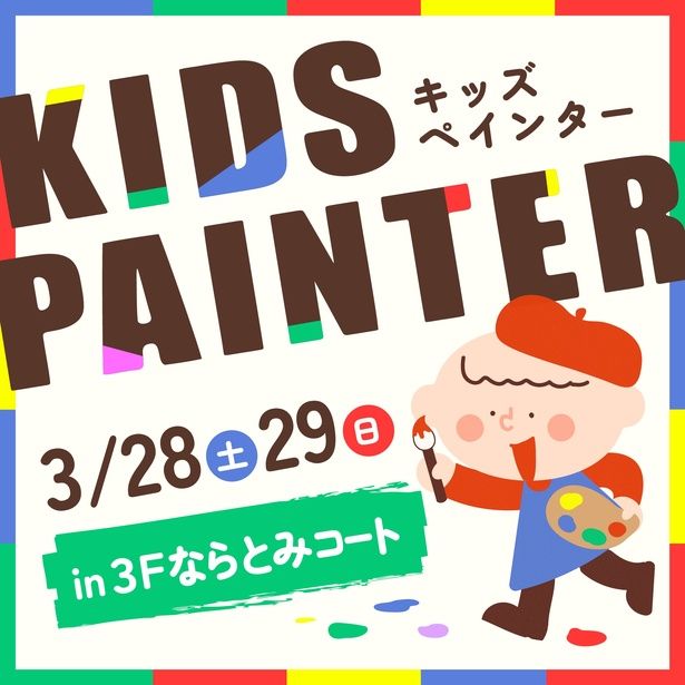 【トートバッグにオリジナルアートを描こう!キッズペインター】イオンモール奈良登美ヶ丘 3Fならとみコート / 奈良県生駒市鹿畑町3027 / 2026年3月28日(土)・29日(日) / 10:30~16:30 / 参加費300円。イオンモールアプリのキッズクラブクーポン利用で1人100円引き / 各回定員13人(各日45分8回制)。10:00より会場にて整理券配布
