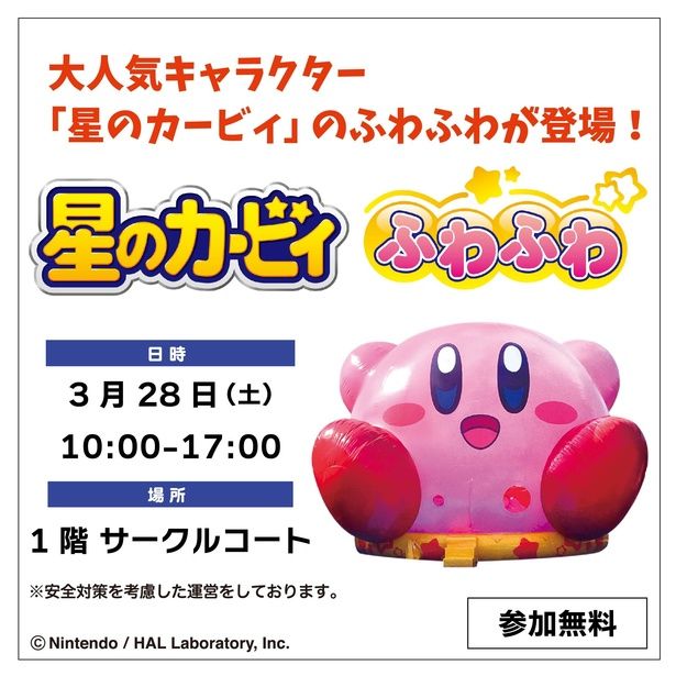 「星のカービィ」の形をした巨大なふわふわ遊具が登場。小学生以下であれば誰でも自由に中に入って、飛んだり跳ねたりしながら楽しく体を動かして遊ぶことができる。利用時間5分間の交代制で、1回の定員は5人から8人まで。1人で入るのが難しい小さい子は保護者と一緒に入って遊ぶことができる。