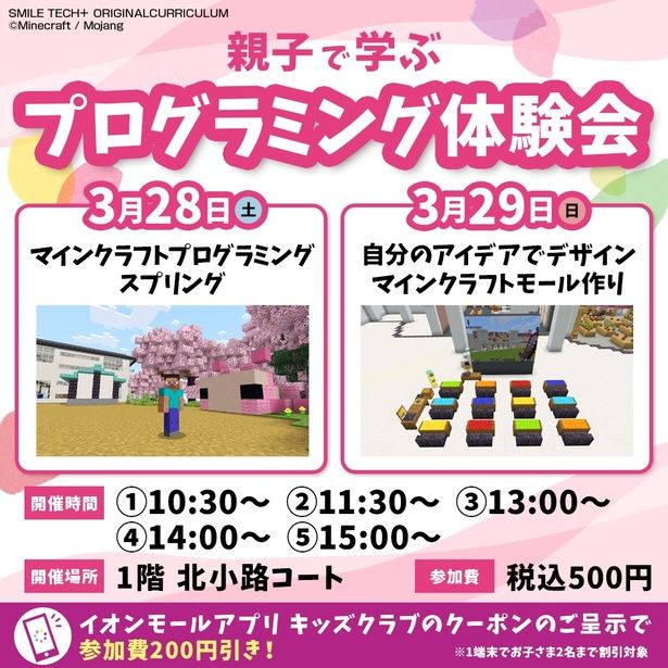ゲームソフト「マインクラフト」を活用したプログラミング体験会。3月28日(土)の「マインクラフトプログラミング スプリング」では、マインクラフト内の体育館でボール遊びをしたり、桜の木を植えたりしながら、楽しくプログラミングを学べる。29日(日)は、「自分のアイデアでデザイン マインクラフトモール作り」を実施。簡単なプログラミングを活用しながら、自分で店や道路を作って楽しむことができる。さらに、参加者全員にオリジナルワークブックがプレゼントされる。