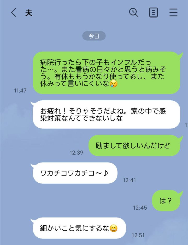 不安な気持ちを夫にLINEしたら、「小さいこと」と扱われたという、投稿者さん。反応がかるかったことに、「モヤモヤした」という投稿を紹介します。子どもたちが次々にインフルにかかり、その看病や、仕事を休まないといけないことを考え、不安になったという投稿者さん。夫にその気持ちを伝えたところ「気にするな」と言われたといいます。夫の言葉にモヤモヤした投稿者さんでしたが、先輩ママたちは、夫の言葉をどう受け取るか聞いてみたいそうです。