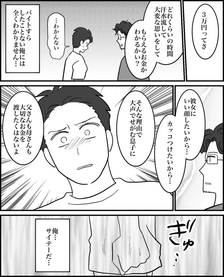 父さんからは「奢ることがカッコいいと思うんだ?」と意外な質問を受けました。親にせびって人に奢るのは泥棒と一緒だという言葉に、俺は自分の身勝手さを痛感。「お金を出すカッコよさは、自分で稼いだ金だからだ」と諭され、そのとおりだと恥ずかしくなりました。