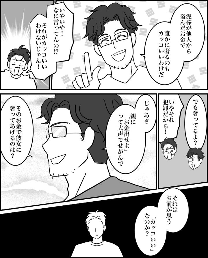 泥棒が他人の金を奪って、誰かに奢るのはカッコいいこと? 父さんからそんなふうに返されて、何も言えませんでした。まるで俺の行動は泥棒と変わらないと指摘されてしまったようなものです。自分の間違いに気付いてショックでした。