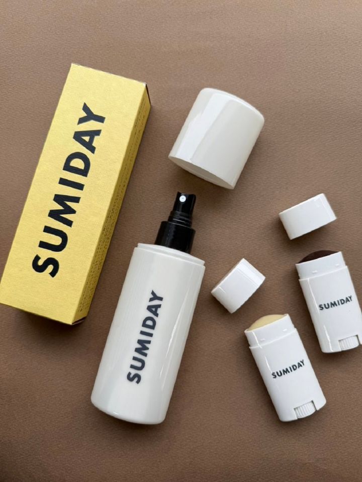 ボリュームアップのスプレーは必須アイテム!ヘアバームのナチュラルはカラーはボディにも使えちゃう。カラーで香りも違うんです。右からSUMIDAY HAIR BALM ダークブラウン 15g¥2,970、SUMIDAY HAIR BALM ナチュラルカラー 15g¥2,970、SUMIDAYニュアンスメイキング&ベーススプレー 145mL¥3,300(株式会社リベルタ)