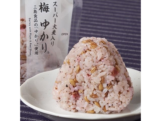 スーパー大麦入りのご飯に、カリカリ梅と三島食品の「ゆかり®」を混ぜ込んだおむすびです。 ※東京都(一部店舗)、神奈川県(一部店舗)での取り扱いです。 東京都の一部・神奈川県の一部で販売