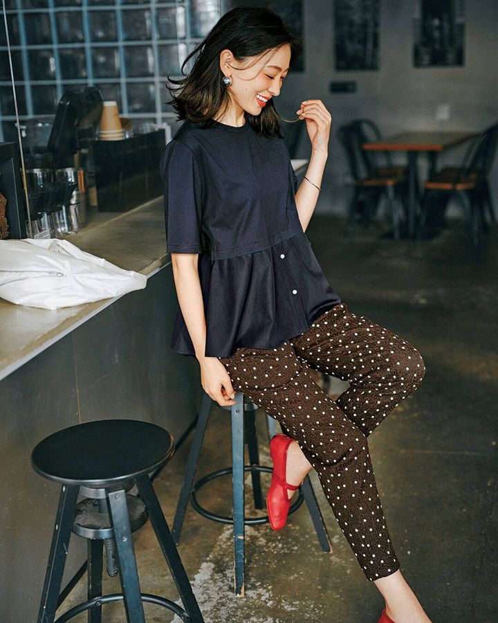 トップス¥15,950(DAY by DAY it’s international)パンツ¥36,300(テラ/ティースクエア プレスルーム)バッグ¥27,500(ツル バイ マリコ オイカワ)ピアス¥69,300(ウノアエレシルバーコレクション/ウノアエレ ジャパン)
