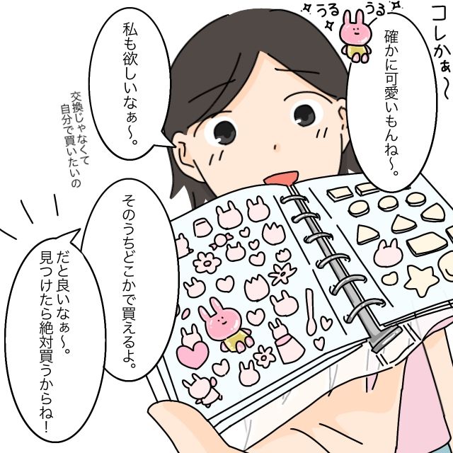 でも、並んでまで欲しがる人がいるのも納得です。うるうるとした質感が可愛くて、つい見入ってしまいます。するとあいがシールをじっと見つめながら「私も欲しいなぁ、交換じゃなくて自分で買いたい」と羨ましそうに言いました。「そのうちどこかで買えるよ」と声をかけると、あいはパッと表情を明るくして「だといいな!見つけたら絶対買うからね!」と、嬉しそうに意気込んでいました。