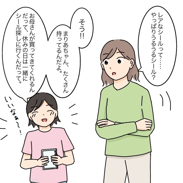 「レアなシールって・・・やっぱりうるうるシール?」そう聞くと、あいはうんうんと頷いて「そう!まりあちゃん、たくさん持ってるんだよ!お母さんが買ってきてくれるんだって、お休みの日は一緒にシールを探しに行くみたい」と羨ましそうに言いました。