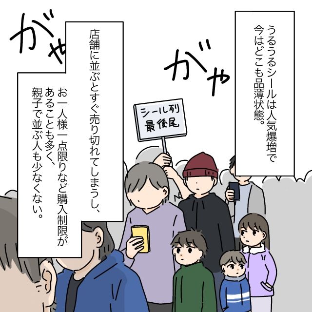 うるうるシールは、今や人気爆増でどこも品薄状態。つやつやした見た目が可愛いと口コミで広がり、欲しがる人が一気に増えたことで、すっかりレアアイテムになっているそうです。お店に並んでもすぐに売り切れてしまい、「お一人様一個まで」と購入制限がかかることも珍しくありません。中には、親子で並んで手に入れようとする姿も見かけるほど。