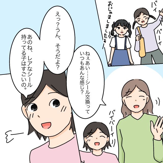 時刻はすっかり夕暮れ時。「おじゃましました」と帰っていくあいの友達に手を振りながら、私はふと気になって「シール交換っていつもあんな感じなの?」と聞いてみます。するとあいは当たり前のような表情で「そうだよ?レアなシール持ってる子はすごいの」と言いました。