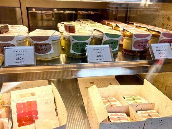 人気の「アキウプリン」はプレーン、抹茶、燦燦園のイチゴの3種類。 竹炭を飼料として育てた鶏から生まれた「竹鶏たまご」と甜菜糖が使われているのだそう。