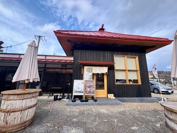 秋保の人気カフェレストラン「アキウ舎」の敷地内にある「菓と土」。江戸時代に建てられた馬小屋をリノベーションした、モダンでシックな建物は、赤い屋根に墨黒の外観が印象的です。