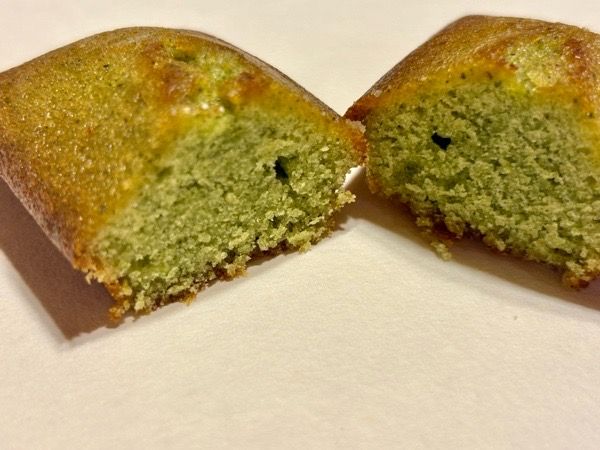 「フィナンシェ(小松菜)」(300円) 小松菜のほろ苦い風味とバターの香りが調和して、爽やかな味。 自然なグリーンの生地も美しく、無農薬で大切に育てられた小松菜をいただいている感謝すら感じさせるフィナンシェです。