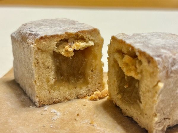「焼き立て秋保石菓」(350円) 四角い武骨な外観とは裏腹に、さっくりほろりのクッキー生地と甘酸っぱいリンゴ餡の優しい甘さで、食べたことがない組み合わせ。 親戚も、定番のお土産とは違う、新しい味にとても喜んでくれました。