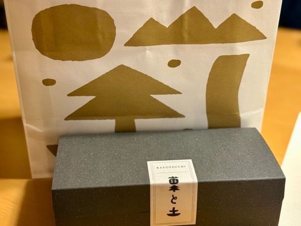 お土産用の「秋保石菓」。 秋保石のような色と質感を感じる箱です。可愛らしいデザインの紙袋に入れていただきました。