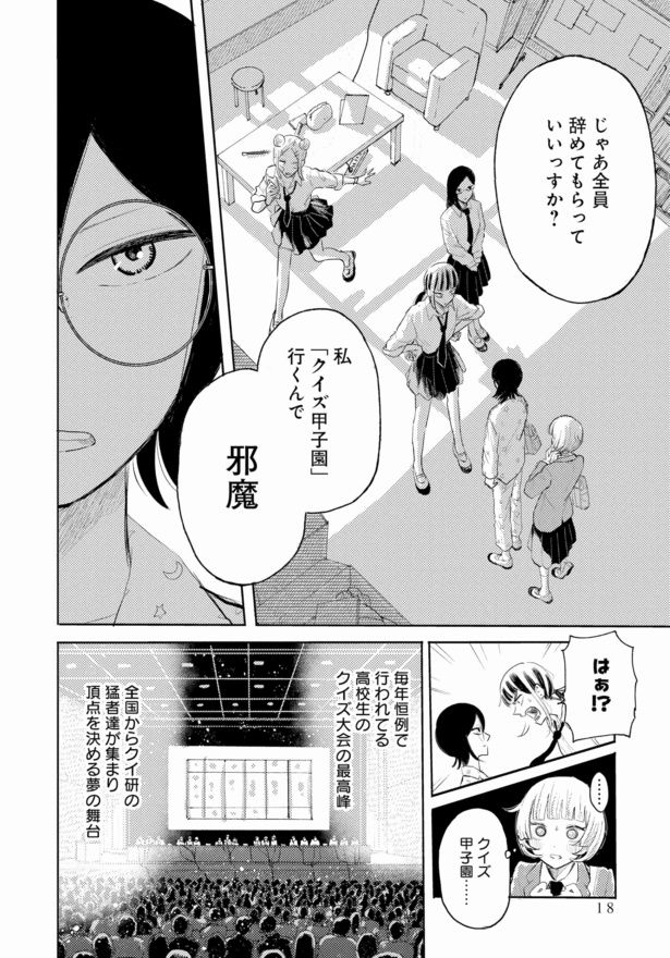 自分の意見をはっきりと持ち、周囲の目を全く気にしない一花と、自分に自信が持てず、あがり症の雪。正反対のふたりが互いに触発しあい、少しずつ変化していくさまを見守るにつれ、私たちの口角は自然と上がっていく。雪は早押しを克服することができるのか。仲間など要らないと思っている独りよがりな一花は、このクイズ研究会のなかでどう変わっていくのか。