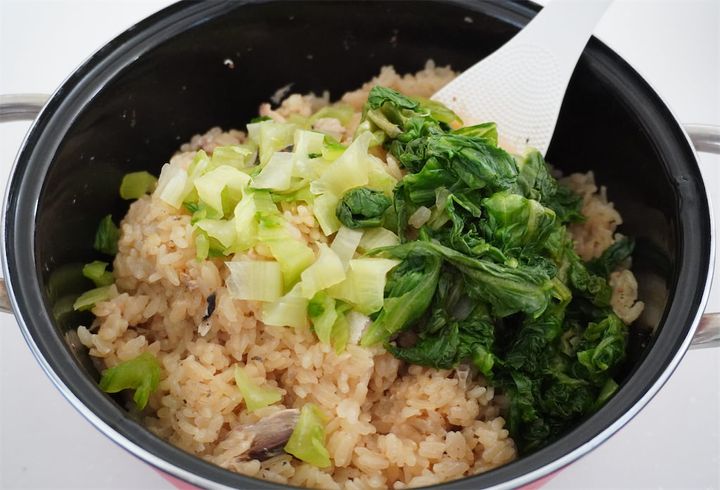 5. ご飯が炊き上がったら火を止めてフタをしたまま10分蒸らし、4のグリーンリーフを加えて混ぜる。